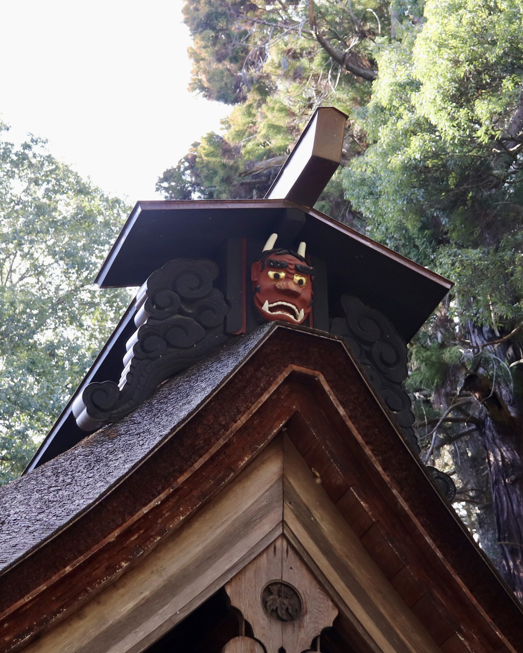 当神社の本殿屋根には、魔除けの意味をもつ鬼面が静かに佇んでいます。