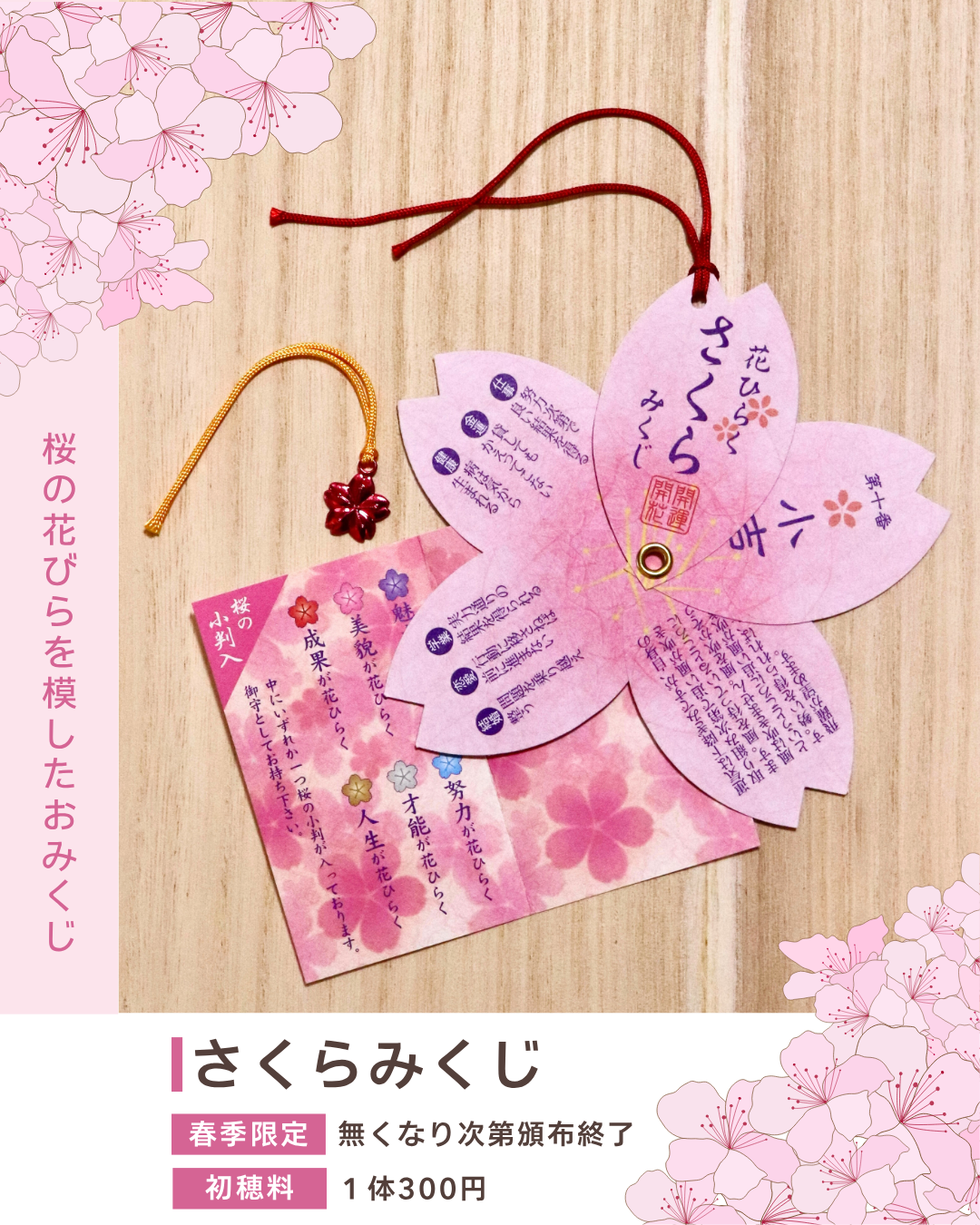 桜の花びらを模したおみくじの中には、桜の小判が一つ入っており、お守りとしてお持ちいただけます。